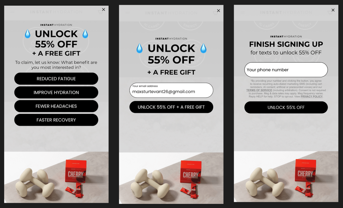 Most use quiz-based pop-ups that first ask a question before requesting an email, creating engagement before conversion.