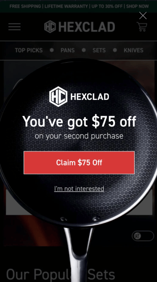 First, it asks a fun question over an image of the pan (“Want $75 off your next purchase?”), then it asks for email… and then SMS.
