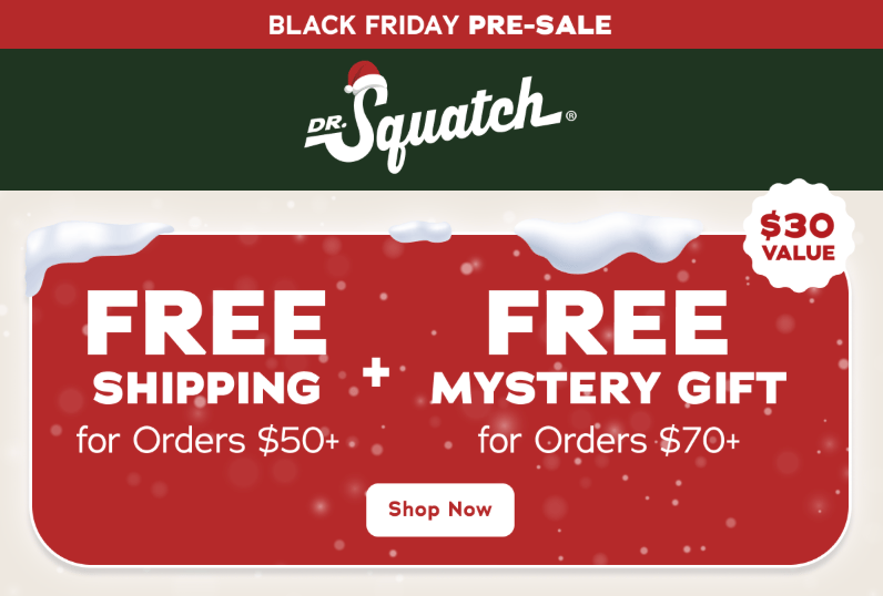 Great twist offer from Dr. Squatch. Could easily apply to a Cyber Monday offer as well.